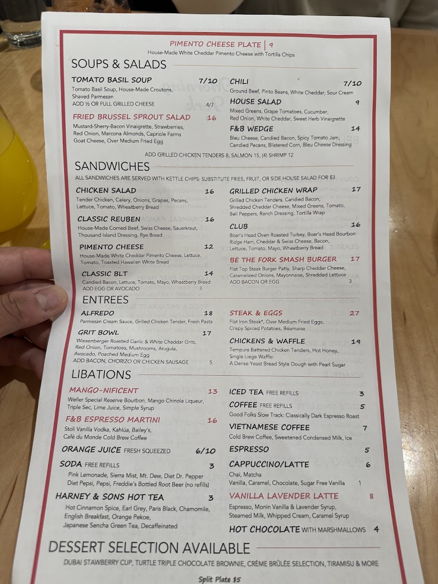 Smoked Salmon, Over Medium Fried Eggs, Boursin Cheese Spread, Cucumber, Mixed Greens, Pickled Red Onion, Croissant, Fresh Fruit